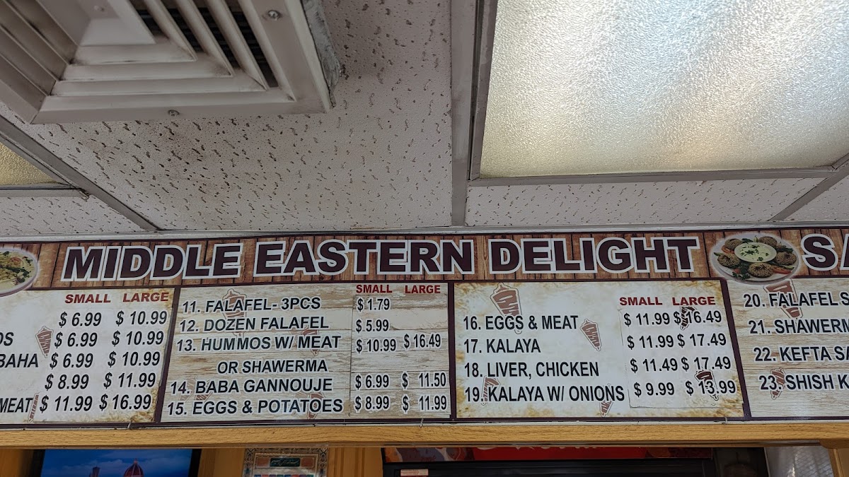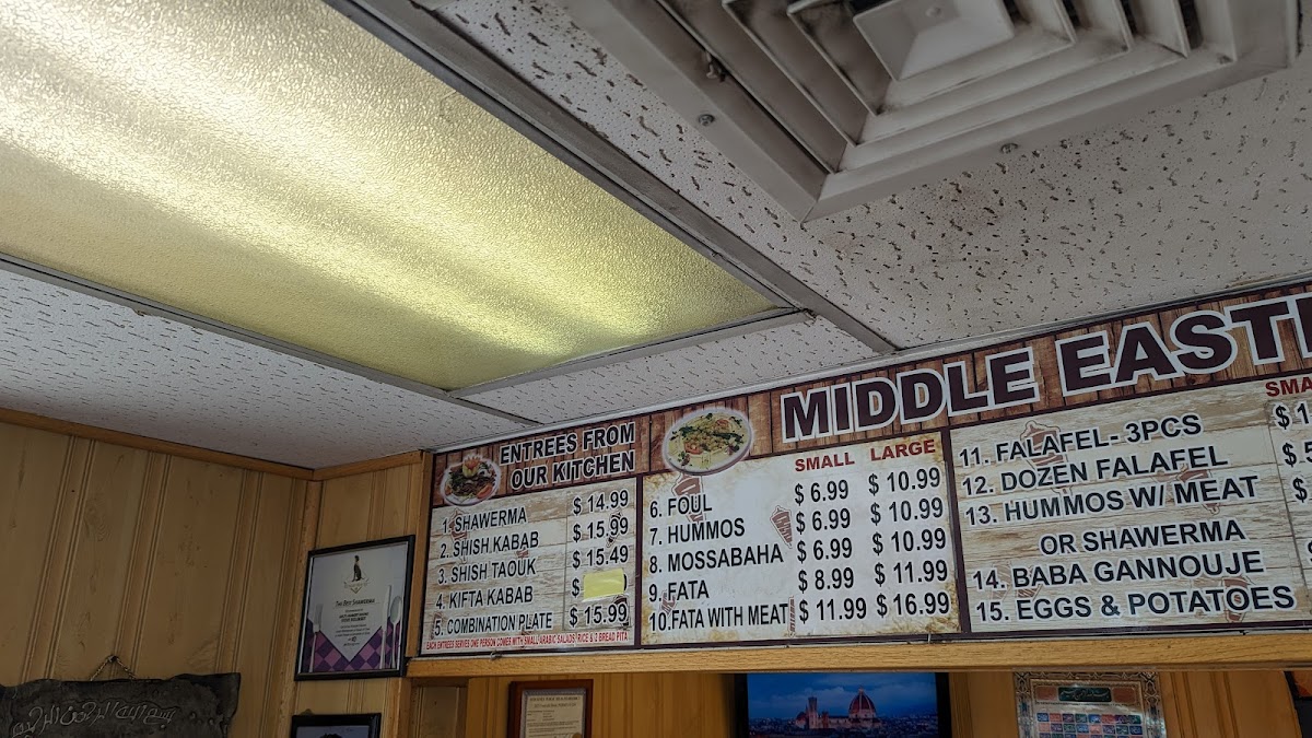 Sandwiches: A variety of sandwich options are available, including Falafel, Shawarma (both chicken and beef), Kefta, Shish Kabab, and mixed meat selections. These sandwiches are typically served with a drink, providing a convenient choice for lunch or a light meal. Prices range from approximately $4.60 to $6.00.